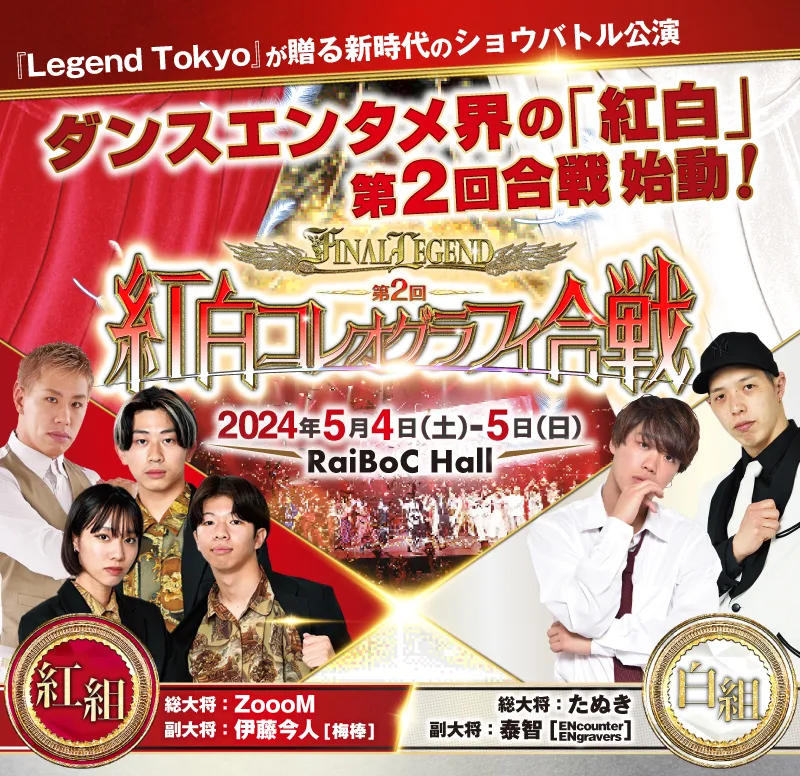 そんな悩みにお応えするために、今年のGWに開催されるダンスエンタメ公演『FINAL LEGEND -第2回 紅白コレオグラフィ合戦-』にて、『#アニコレ レジェンド』の大会ルールに沿って制作したエキシビション作品の紅白対決による披露が実現!