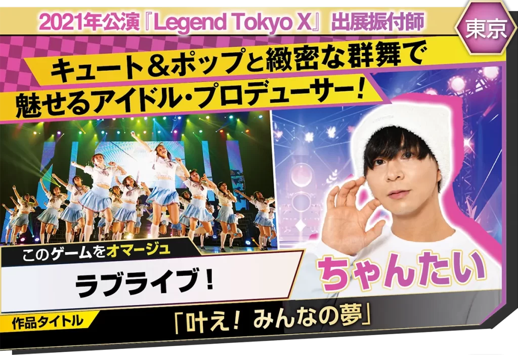 『Legend Tokyo X』出展!!ちゃんたい拠点地域:東京 / ジャンル:アイドル PROFILEアイドル振付師として活動しながらアイドルグループ「Strawberry Girls」「Blueberry Girls」をプロデュース。『Strawberry Girls 2nd Anniversary Live!』はZepp DiverCit... -