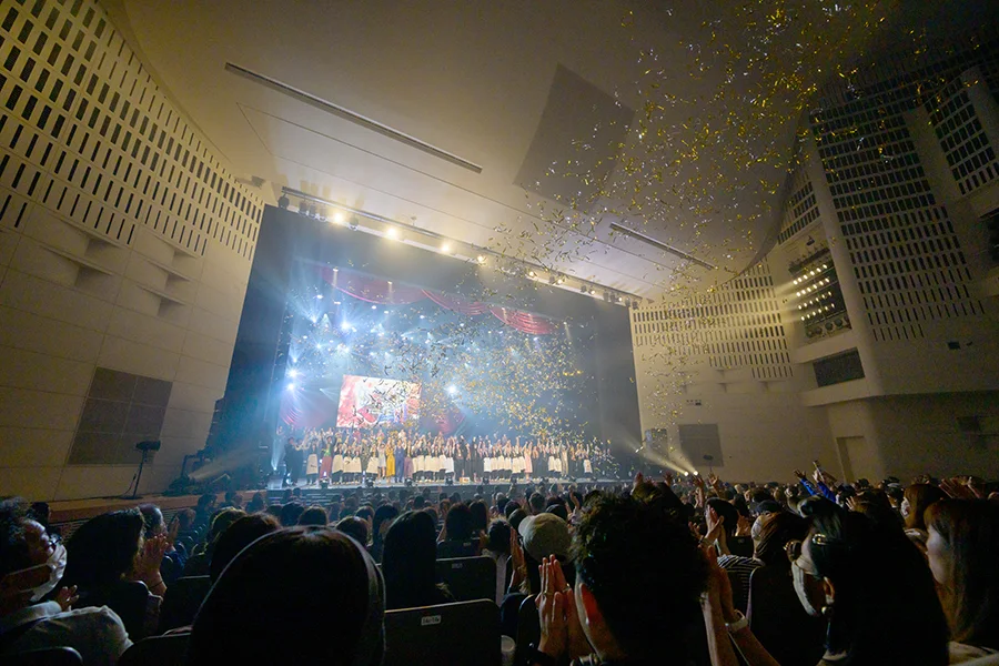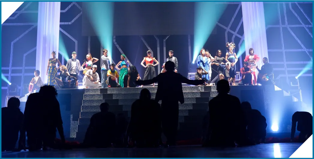 ステージ上には高低差のある大型舞台セットを設営。大会に参加する全作品が事前にテクニカル・リハーサルを行ない、照明までしっかり創りこんだ〝エンタメショー作品〟として披露します。